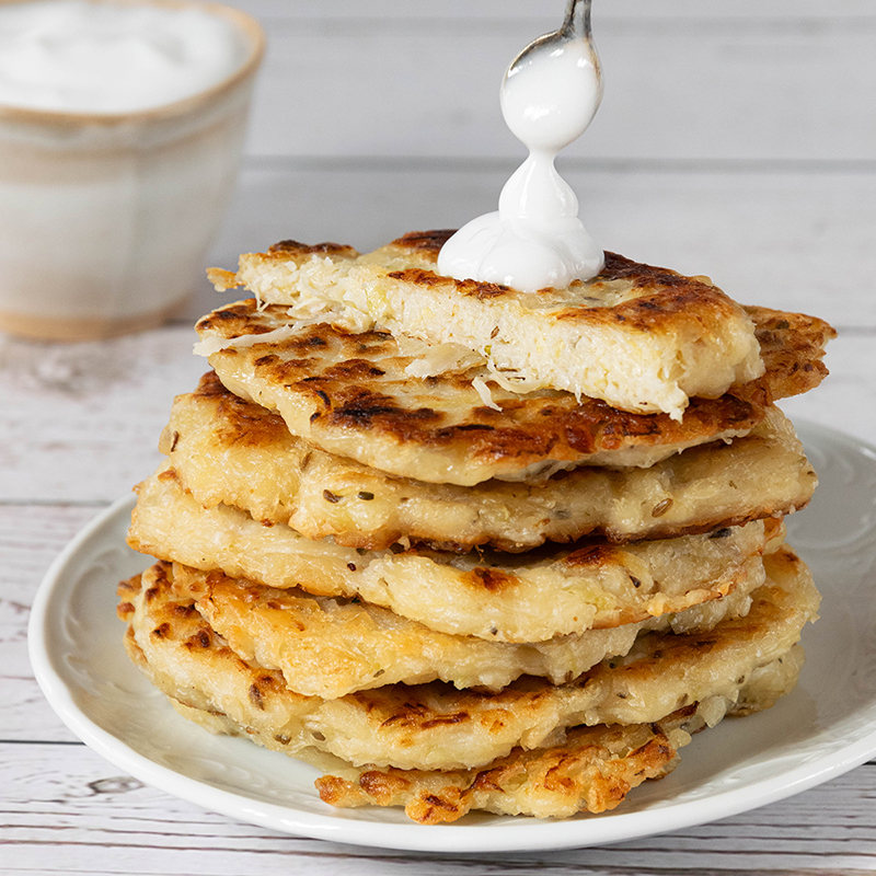 Joliment dorées, agréablement acidulées, légèrement épicées, ces galettes / pancakes sortent vraiment de l’ordinaire. A servir avec du yaourt végétal nature (ici au lait de coco) pour remplacer la crème fraîche traditionnelle.