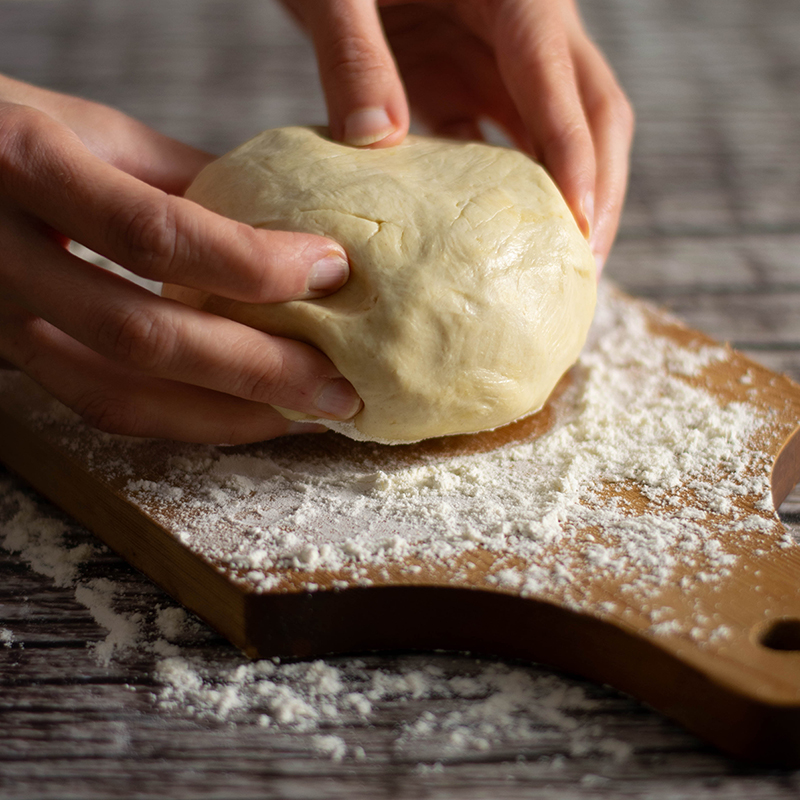 Bien travailler la pâte en l’écrasant plusieurs fois sur une planche avec les paumes de tes mains.